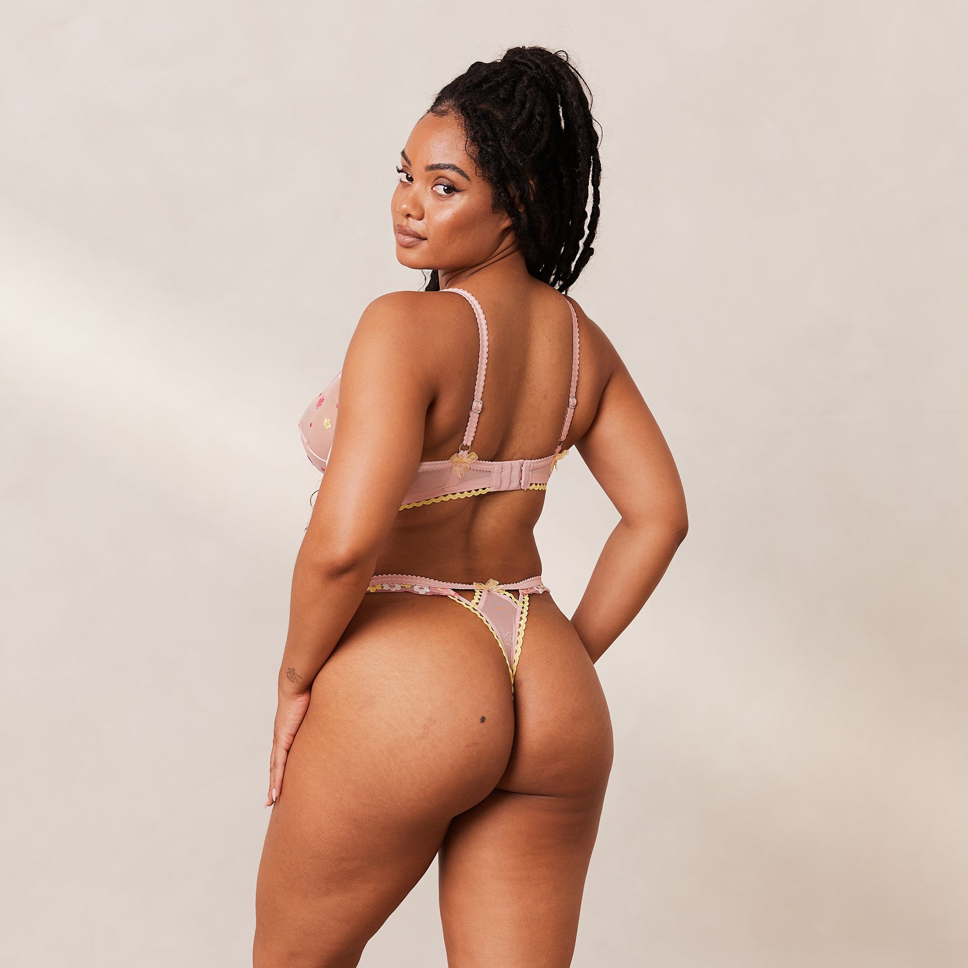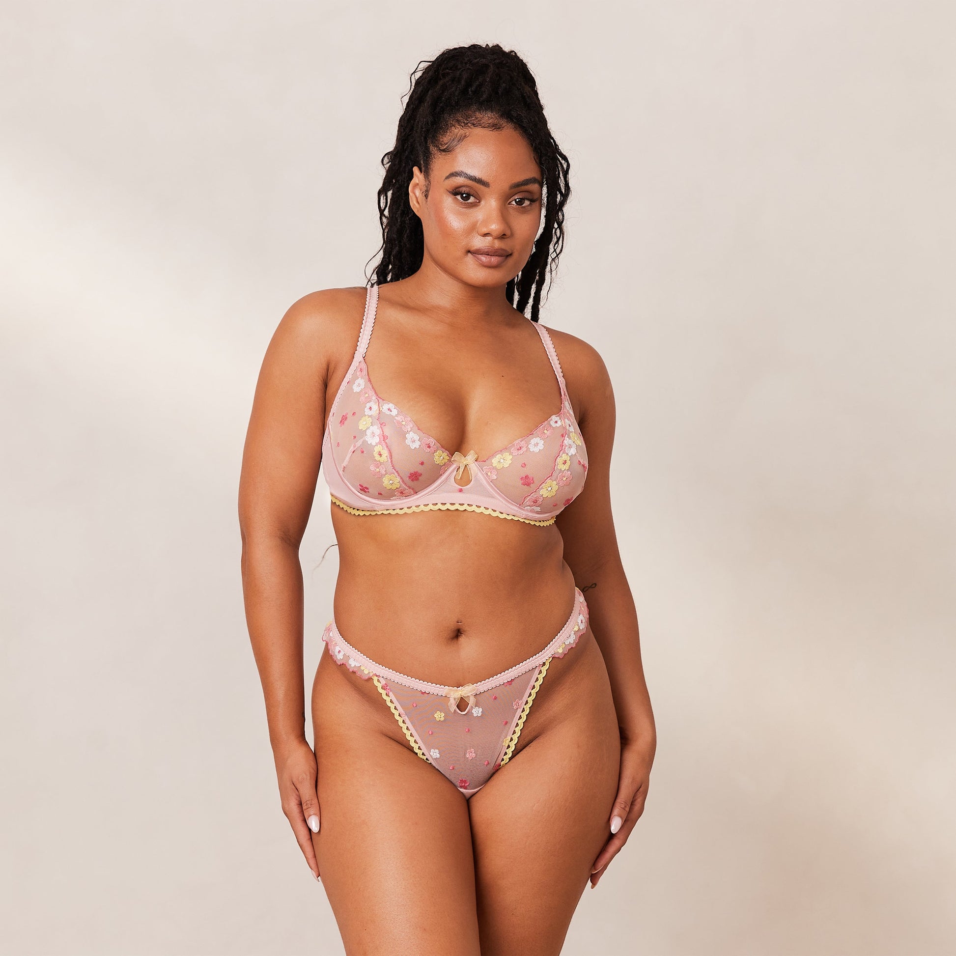 It's your time to bloom in our Fleur Balcony Set. Featuring floral and polka dot embroidery with a floral stretch mesh and cut out details to the front, you'll be Lounging in luxury all summer long.